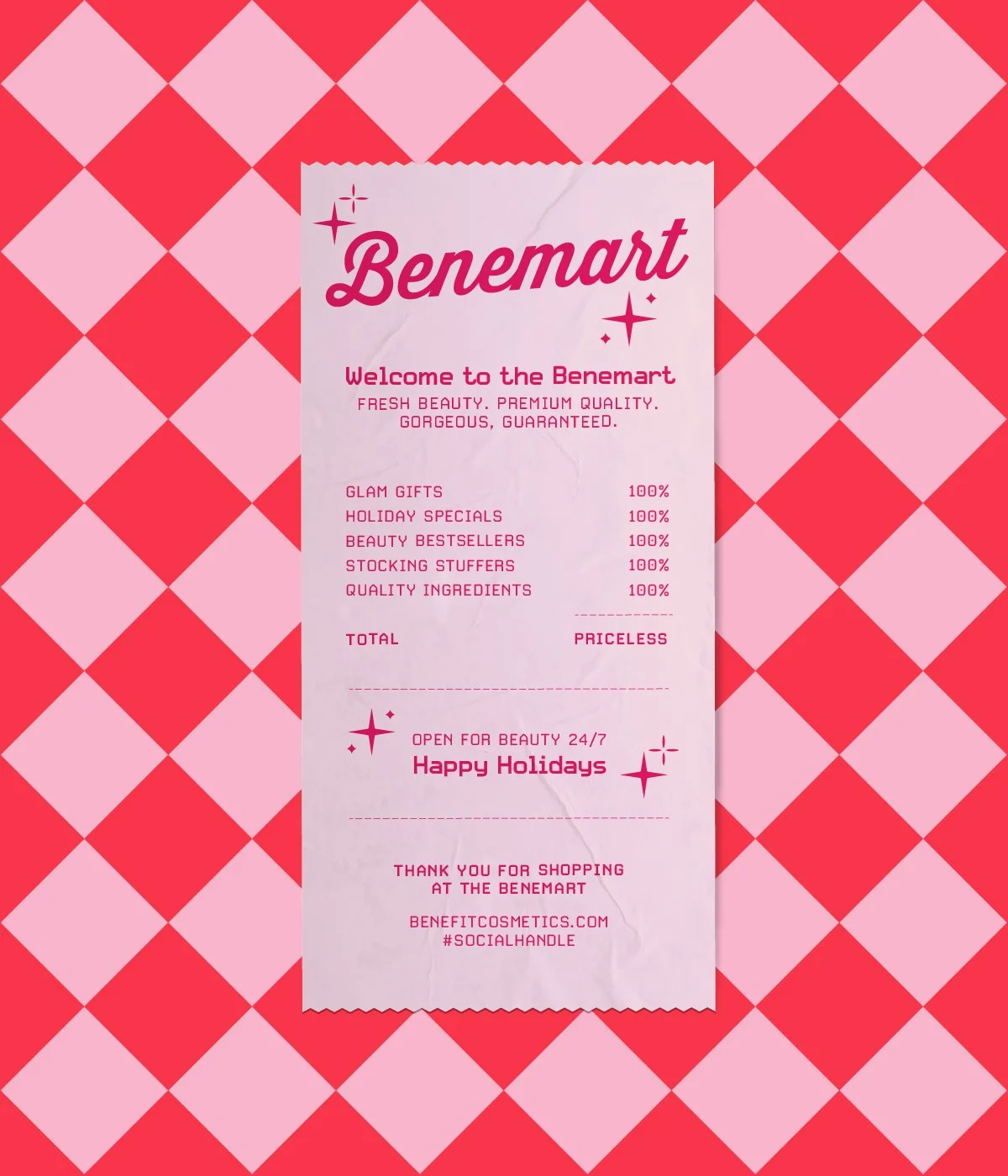 Benefit wanted to shake up the holiday category by reimagining their usual holiday collection into something fresh and surprising, like strolling through a supermarket aisle during the festive season. The concept was to merge the everyday, something universally familiar, with the magic of the holidays.